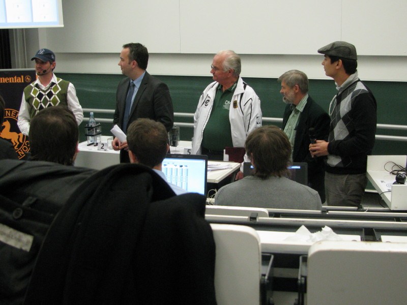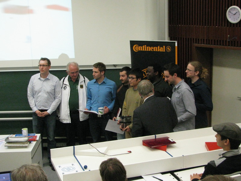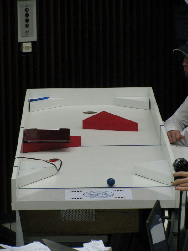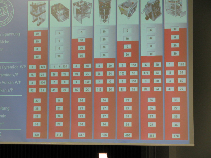 Jedes Jahr veranstaltet die TU Darmstadt ein solches Projektseminar, um den Studenten Gelegenheit zu geben, theoretisch Erlerntes in Teamarbeit in ein selbst konstruiertes Labormodell umzusetzen um Erfahrungen für die spätere Berufswelt zu sammeln und sich im Wettstreit mit den anderen Gruppen zu messen.  Kekstrenner, Zahnpastatubenausdrücker, Schokoriegelteiler waren u.a. schon Aufgabenstellungen. Diesmal also Minigolfroboter. Sie sollten in der Lage sein, auf zwei kleinen (2m lang, 70 cm breit), in den eigenen Werkstätten gefertigten Bahnen, die Minigolfbälle mit möglichst wenigen Schlägen einzulochen. Die beiden Bahnen hatten Ähnlichkeiten mit den Pyramiden und dem Vulkan. Alle Gruppen präsentierten ihren methodischen Lösungsweg in kurzen Referaten, berichteten von ihren in der Praxis auftretenden Herausforderungen und priesen teils sehr selbstbewusst die Vorteile ihres Modells. Phantasievolle Namen (EMKube, EMKlopper, EMKugelWilli, EMKaltstarter, EMKöpfchen, MFTigerWoods) hatten sie jedenfalls, die kleinen Brüder von R2D2 und C3PO. Als eingefleischter Minigolfer hätte ich mir einen EMKapke gewünscht. Aber unsere Minigolfasse sind halt nur bei den Insidern ein Begriff.