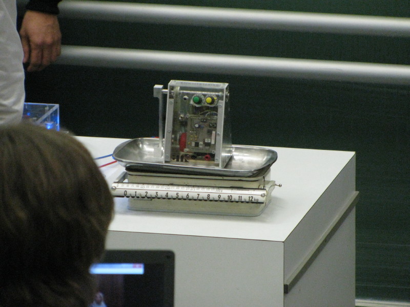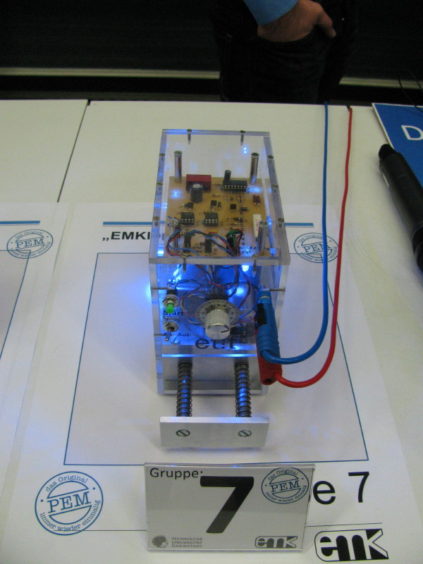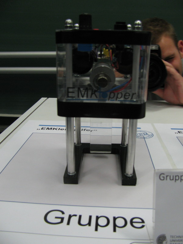 Enge Auflagen bei Grundfläche (DIN A5), Masse (max. 3 Kg) , Volumen (max. 3 l) und Energieverbrauch (max. 36 W), verfügbarer Werkstattzeit (10 h) sowie Kosten (75 €) für zugekaufte Teile liessen kleine Geräte entstehen, die alle im elektrischen Teil ähnlich, mittels Potentiometer über eine Elektronik Platine die Schlagstärke variieren konnten. Allerdings die Umwandlung der elektrischen Energie in die kinetische Energie für die Bewegung des Balls wurde auf unterschiedlichste Weise realisiert. Über Hebel per Elektromagnet, Zahnstangenantrieb hinter einem Elektromotor, schwingende Klappen und Hebel über Getriebe und Transmission angetrieben, Impulsübertragung durch Federkraft und eine absenkbare, rotierende Walze waren die unterschiedlichen Lösungen, um den Ball in Bewegung zu setzen. Nachdem die Einhaltung der obigen Vorgaben zu einer ersten Punktwertung geführt hatten, eine Fachjury ihre Wertung für Design, Verarbeitung, Ergonomie und Sicherheit abgegeben hatte, musste der sportliche Wettkampf an den beiden Bahnen die endgültige Entscheidung bringen. Schnell wurde klar, dass der Vulkan die grössere Hürde war. Einige der kleinen Geräte hatten Mühe, die erforderliche Power aufzubringen um den 25 cm hohen, 45 Grad ansteigenden Hügel zu überwinden. Bei einigen Geräten war der Zielvorgang ebenfalls schwierig. Es war nicht so einfach, bei der kleinen Grundfläche der Geräte eine exakte Ausrichtung zu erreichen. Der EMKube hatte mit einer angebauten Laservorrichtung hier Vorteile. Aus der Sicht eines Minigolf Berichterstatters war es natürlich erfreulich, dass das beste Minigolfergebnis (Pyramide 1, Vulkan 2) des EMKlopper letztendlich den Ausschlag für den Gesamtsieg ausmachte.