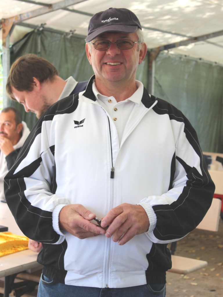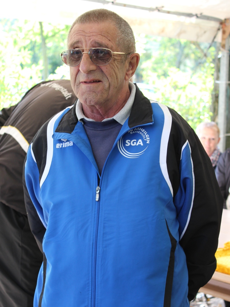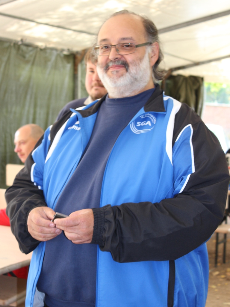 Erich Hess konnte nach dem Essen seinen Vortrag zur Geschichte des HBSV vervollständigen und sich danach, als 1. Vorsitzender der SGA Arheilgen, ein Jubiläumsgeschenk seines Vereins quasi selbst überreichen. Marco Eigenbrod hisste an einem der Fahnenmaste eine große Flagge mit dem HBSV-Logo, die in Zukunft bei allen sportlichen Maßnahmen des Verbandes wieder zu sehen sein wird. Wie angekündigt, wurde im Rahmen der Feier die zweite regionale Pokalrunde (Resultat siehe nächster Bericht) von Elke Rath ausgelost. Als Losfee fungierte der SGA-Jugendliche Maurice Freund.