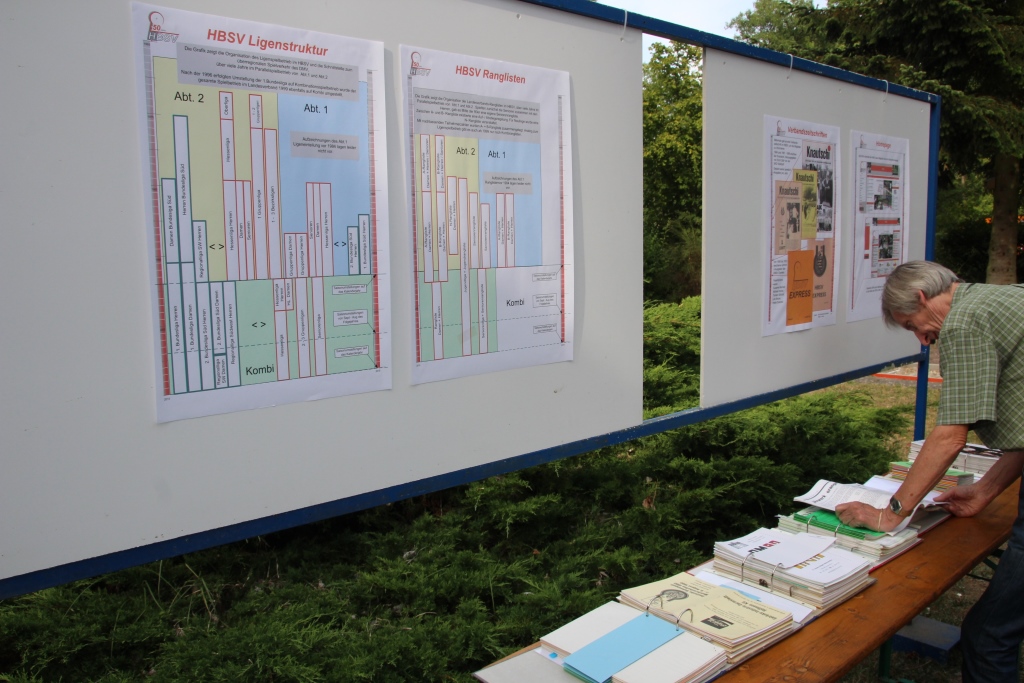 Der HBSV hatte zum 50jährigen Bestehen zu einer kleinen Jubiläumsfeier in den Minigolfpark Arheilgen eingeladen. Am ersten Abend des traditionellen Wappenturniers lockten Zelte, Informationstafeln und ein hessisches Buffet die aktiven Teilnehmer noch eine Weile auszuharren. Dazu gesellten sich die eingeladenen Gäste, zum überwiegenden Teil Minigolfer der ersten Stunde in Hessen. Viele haben sich seit langer Zeit wieder einmal getroffen und konnten alte Erinnerungen austauschen. Bevor die kleine Feier eröffnet wurde, hatten alle die Gelegenheit, sich auf Schautafeln und in alten Verbandszeitschriften und Ergebnislisten über einige Fakten aus der Geschichte des HBSV zu informieren und auf vielen Fotos alte Bekannte wieder zu entdecken. Hier waren einige Vereine, besonders der MGC Wetzlar, der 2.TTC Walldorf, die SG Arheilgen, der MSC Bensheim-Auerbach und der BGSV Bad Homburg, dem Aufruf von Medienwart Günter Arnold gefolgt und hatten Material aus ihren Archiven für die Ausstellung geliefert. Die Eröffnung der Feier blieb dann dem 1. HBSV Vorsitzenden Erich Hess vorbehalten, der einen kurzen Abriss über die Geschichte des HBSV gab. Als zweiter Hauptredner fand der Vizepräsident des llsbh, Ralf -Rainer Klatt, optimistische Worte zum Fortbestand unseres Sportes. Er war schon etwas eher angereist, hatte die Turnierspieler bei ihren letzten Bahnen beobachtet und war sichtlich beeindruckt von den Darbietungen der Minigolfer.
